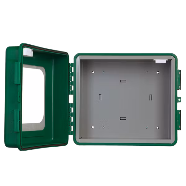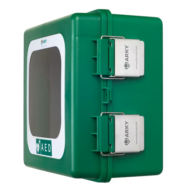 Grönt väggskåp tillverkad av slagtålig polystyren. Skyddar hjärtstartaren mot temperaturer ned till -40°C
